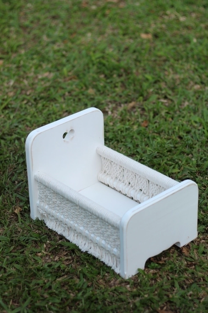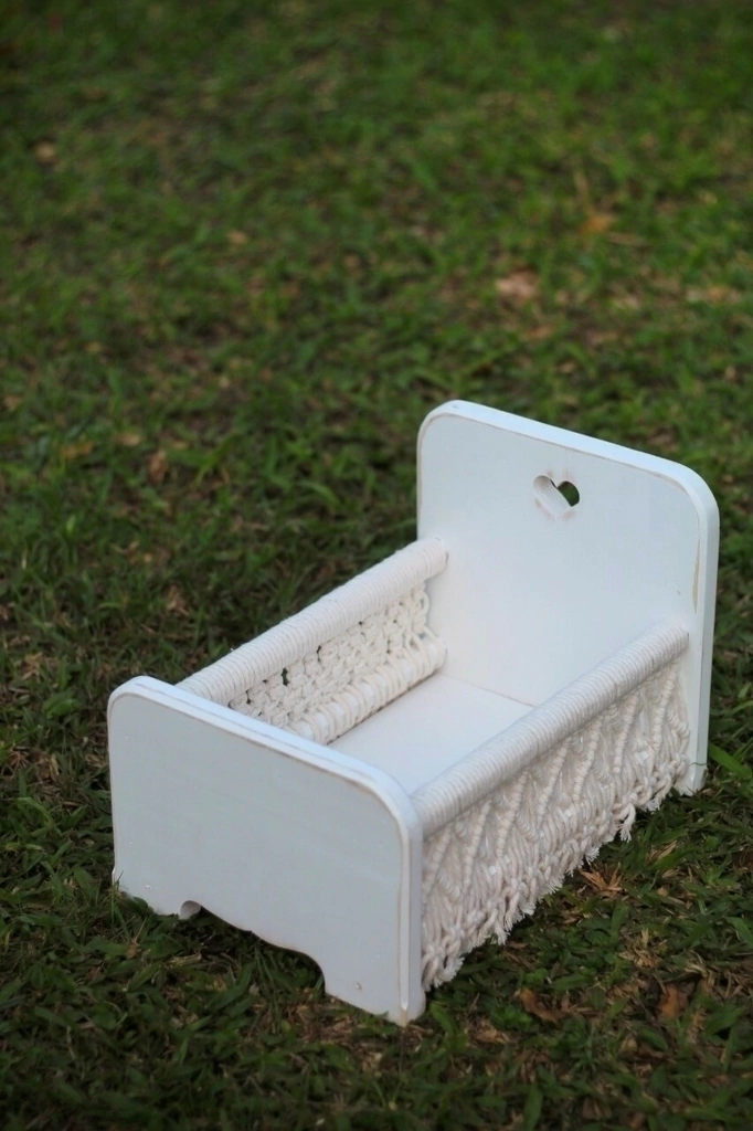 Bercinho com detalhes em macramê para ensaios newborn e acompanhamento. Desenho do macramê diferente nos dois lados, para você poder ter mais variações com o mesmo prop.