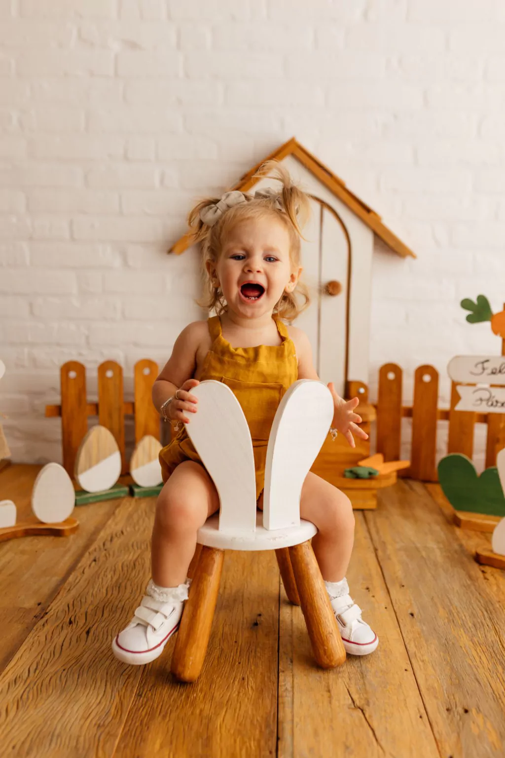 Linda cadeira com orelhinhas de coelho. Com pés torneados, vai ficar uma graça no seu cenário de Páscoa.
