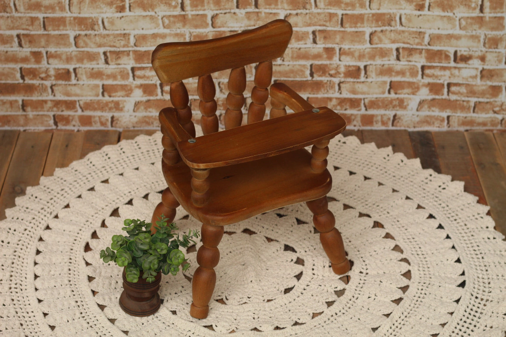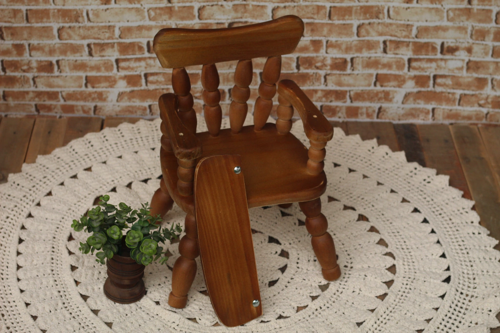 Ela tem detalhes torneados e braços, linda para compor cenários de fotografia infantil, principalmente crianças menores que precisam de apoio para ficarem mais seguras.