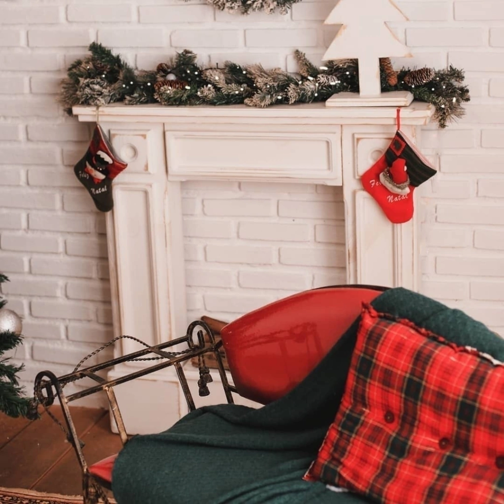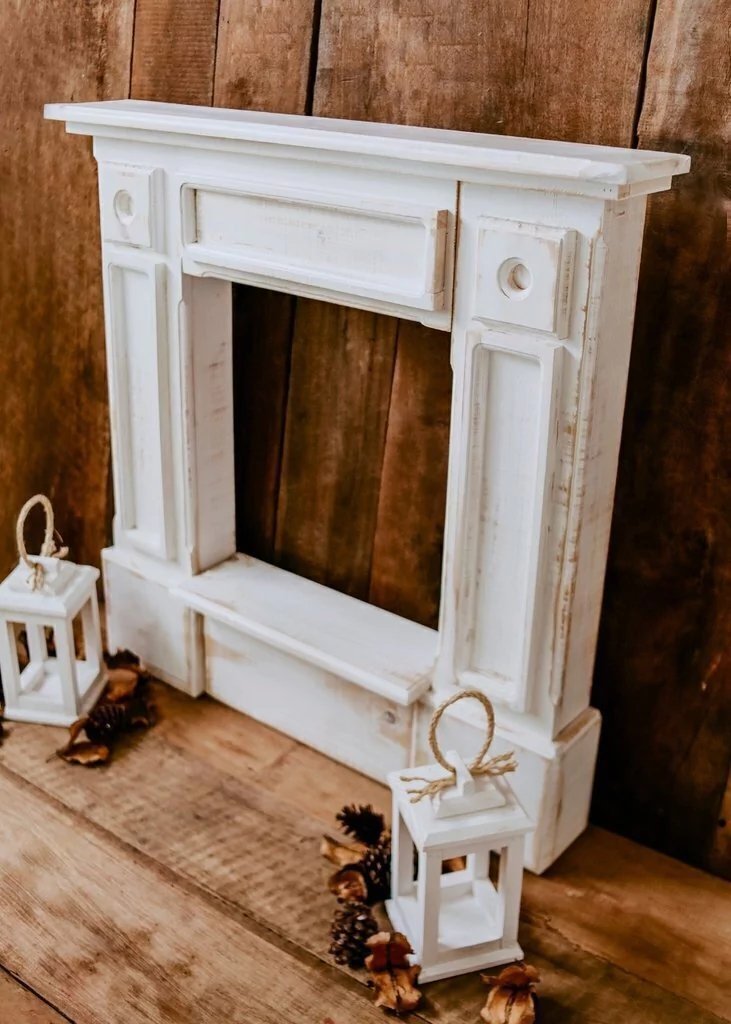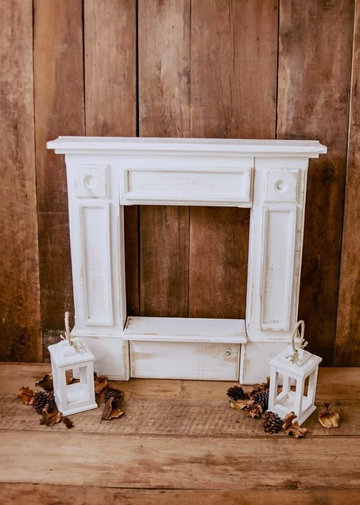 Lareira de madeira com acabamento em pátina (pintura desgastada), que deixa a peça linda, muito versátil e com estilo vintage. Linda para uso em sessões de natal.