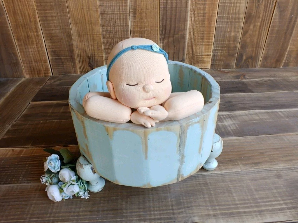 Tina de madeira com pés torneados, e acabamento em pátina (pintura desgastada), que deixa a peça linda, muito versátil e com estilo vintage. Para uso em composições de fotografia newborn e acompanhamento.