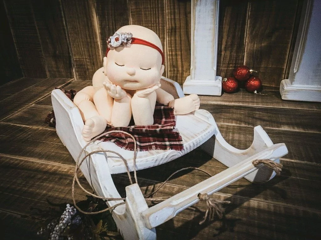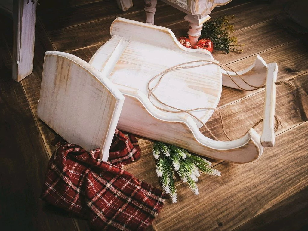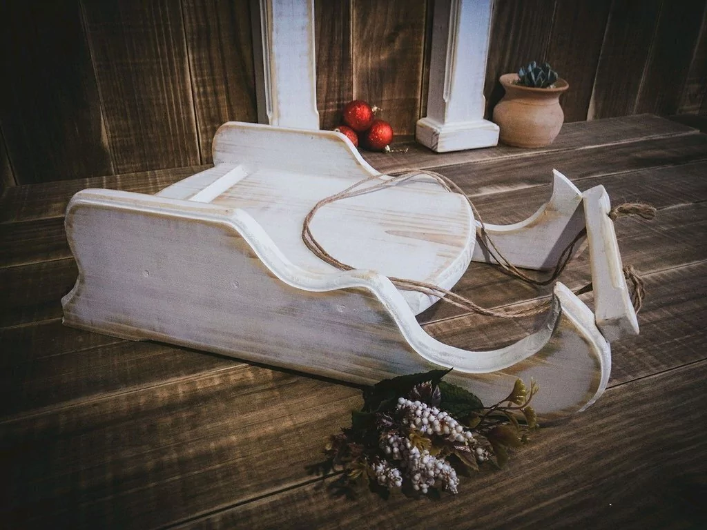 Lindo trenó em madeira, com encosto removível. Pode ser usado para fotografia newborn e acompanhamento.